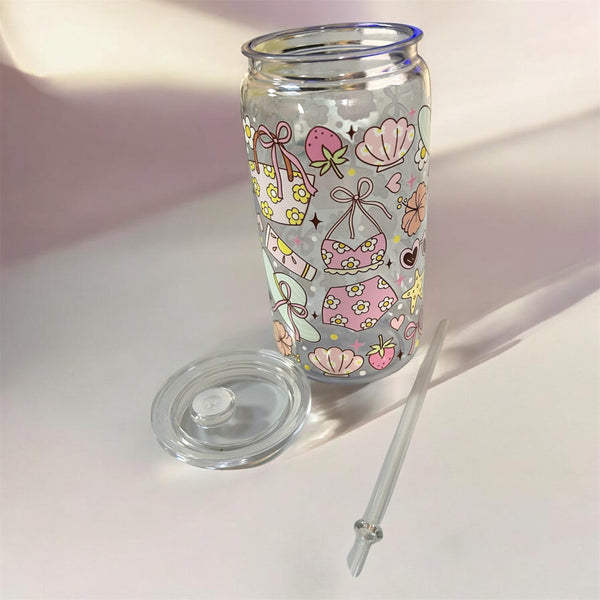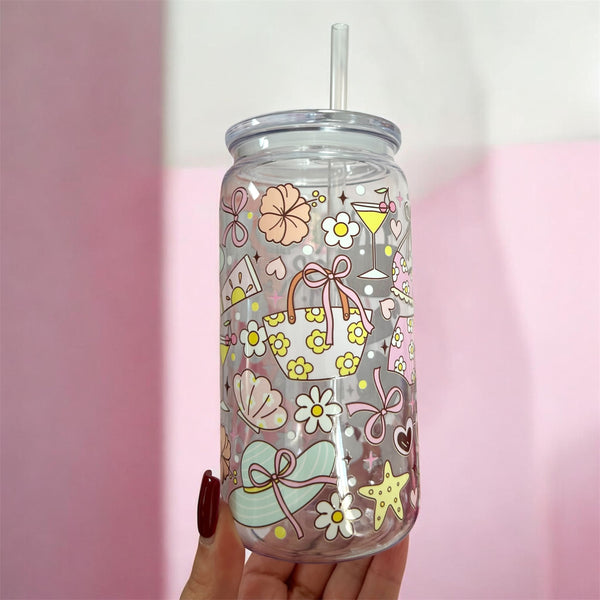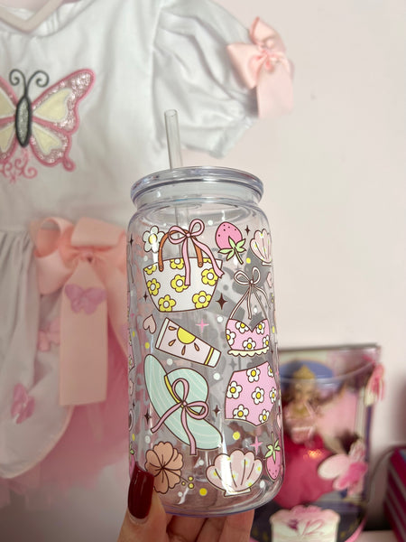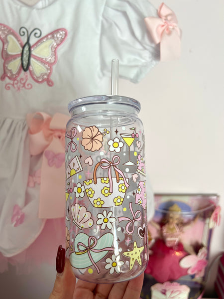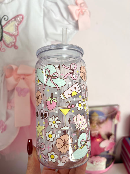 16oz plastic cup, lid and straw. All cups come with a straw brush for cleaning.