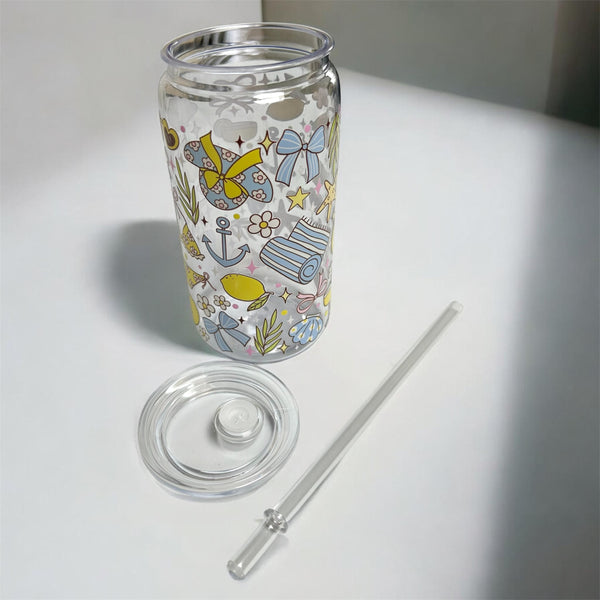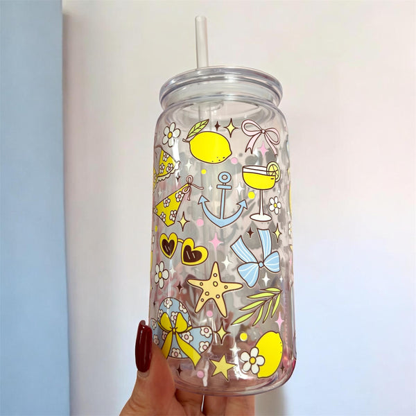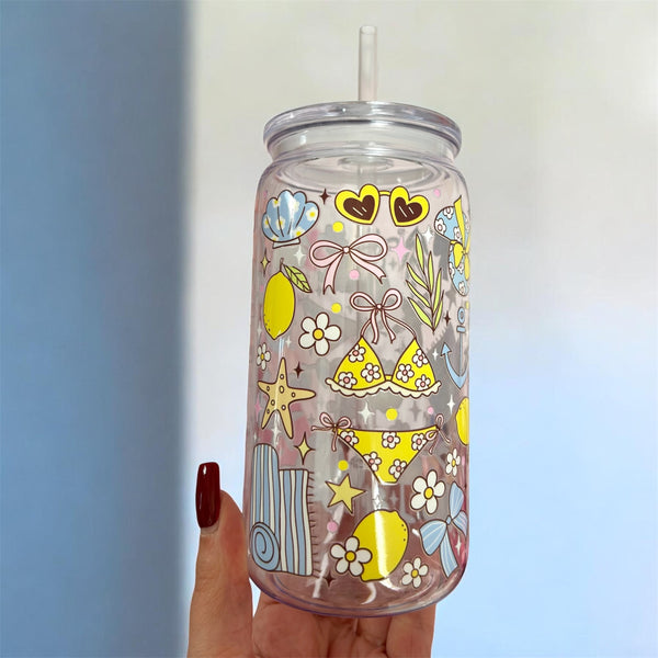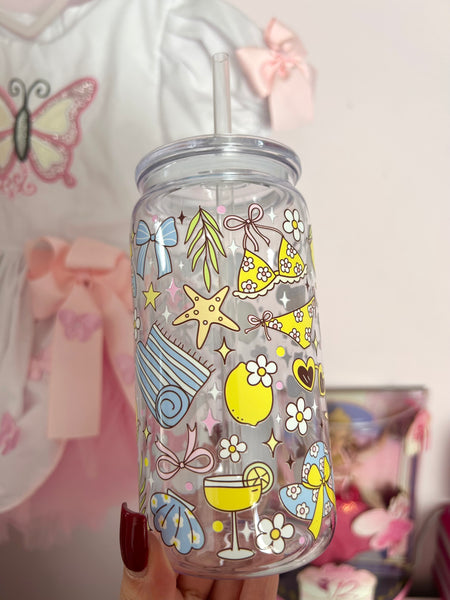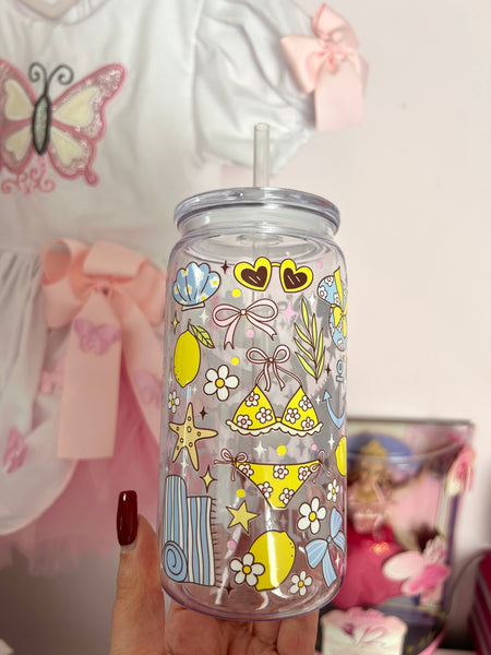 16oz plastic cup, lid and straw. All cups come with a straw brush for cleaning.