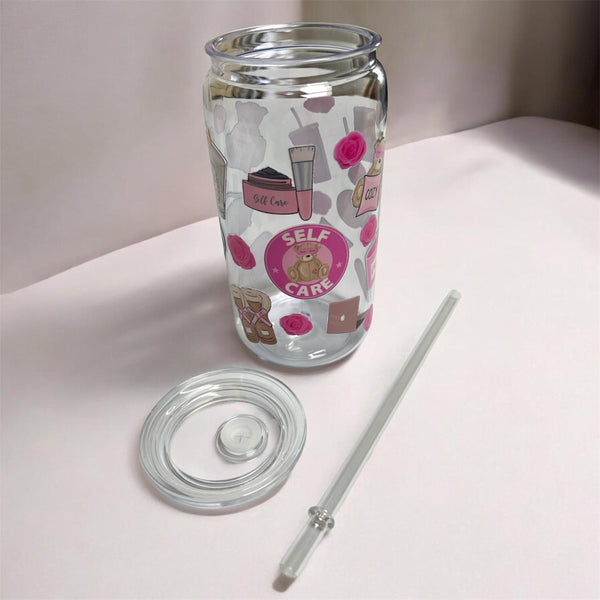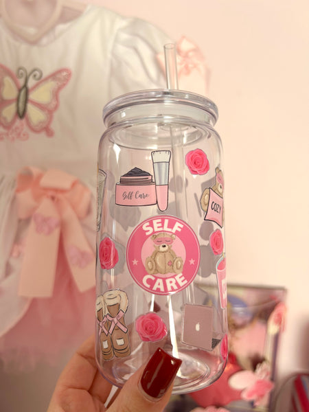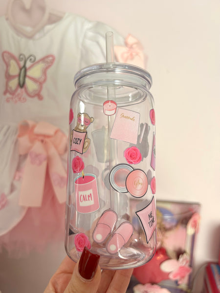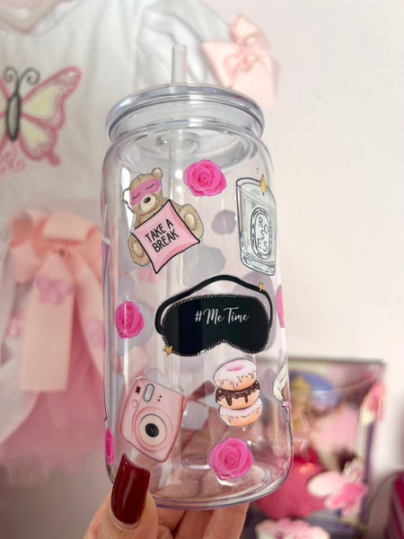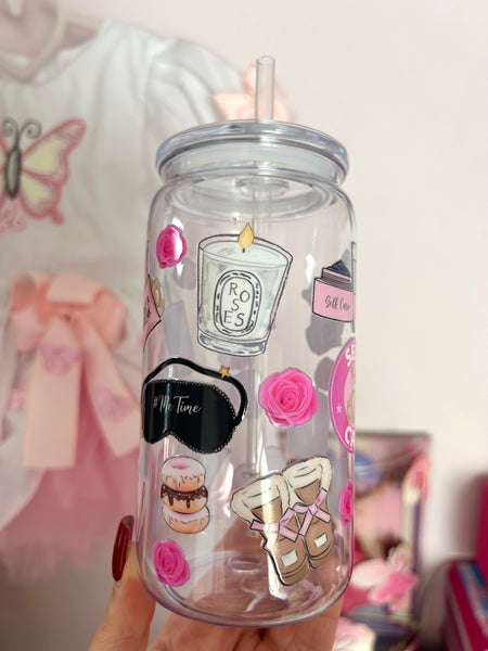 16oz plastic cup, lid and straw. All cups come with a straw brush for cleaning.